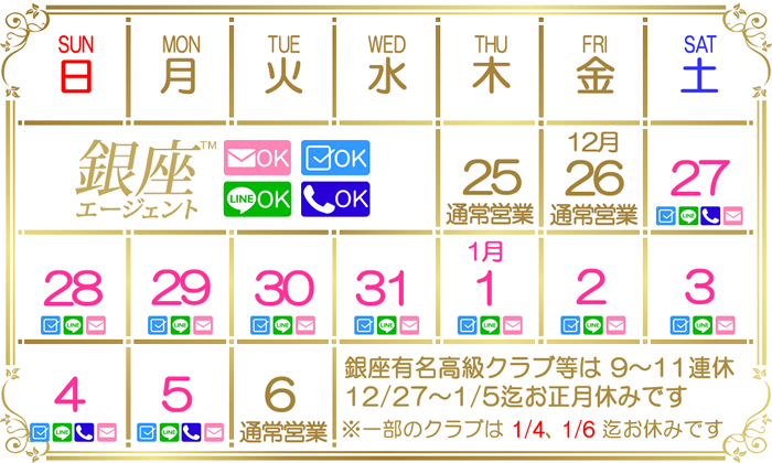 銀座の一流有名高級クラブ及び当社を含め年末年始のお休み期間のお知らせをさせていただきます。銀座の大半の高級クラブのお休み期間は2025年12月27日(土)~2026年1月5日(火)の10連休となります。クラブによって期間が異なります。